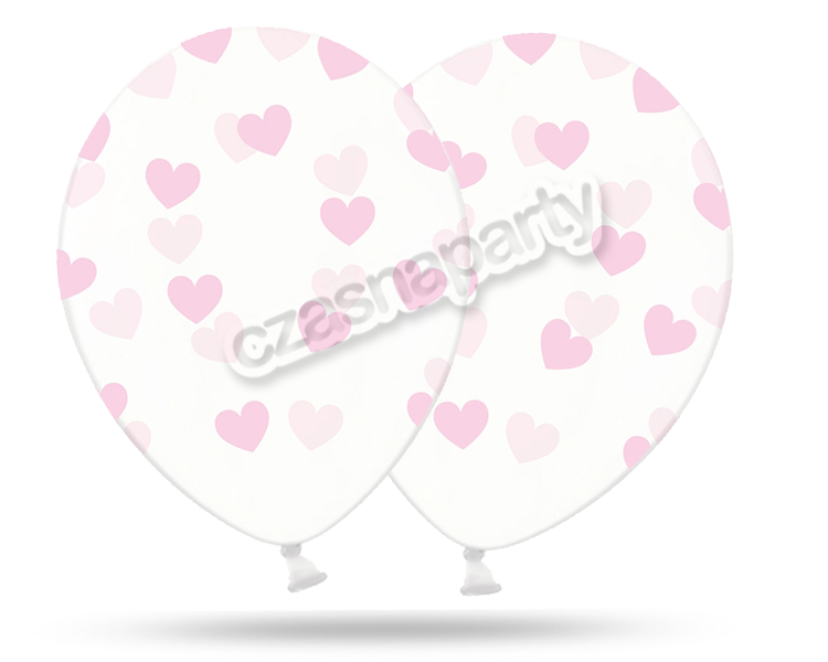Balon gumowe, Crystal Clear – przezroczyste z pięciostronnym nadrukiem w jasno różowe serduszka. Wielkość: 12 cali (30 cm).