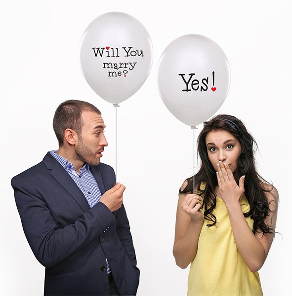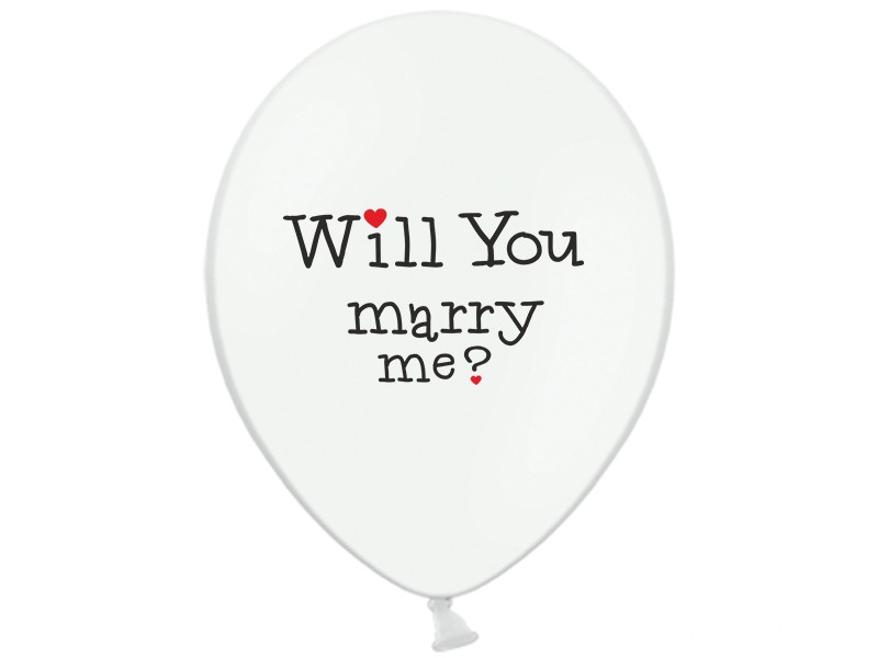 Balon lateksowy biały z dwustronnym nadrukiem Will You marry me? Rozmiar 30 cm (12 cali). Doskonały na sesje zdjęciowe.