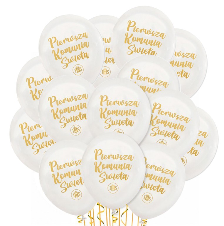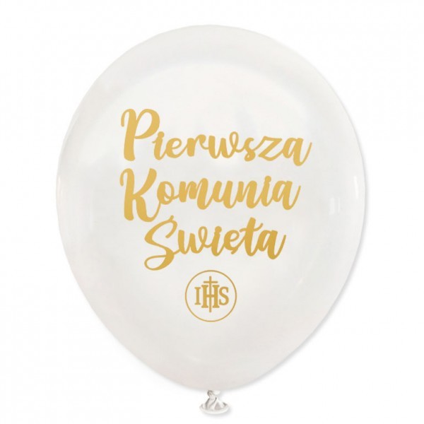 Balon dekoracyjny, na Komunię. Kolor biały ze złotym nadrukiem. Rozmiar 12” tj. około 30 cm. Mocne.