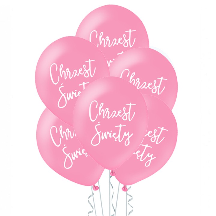Balony gumowe w kolorze różowym z białym nadrukiem Chrzest Święty. Rozmiar 30 cm. Doskonałe do napełniania helem jak i powietrzem. W opakowaniu 10 szt.