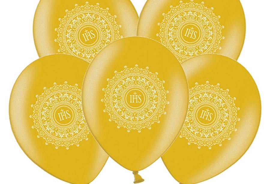 Balony 12″ – 30 cm cm metallic złote z nadrukiem białym. Komplet zawiera 5 szt.