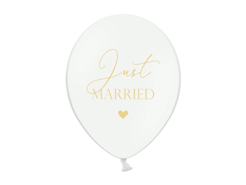 Balony Strong, Pastel Pure White ze złotym dwustronnym nadrukiem Just Married. Rozmiar balona to 12 cali (30 cm)