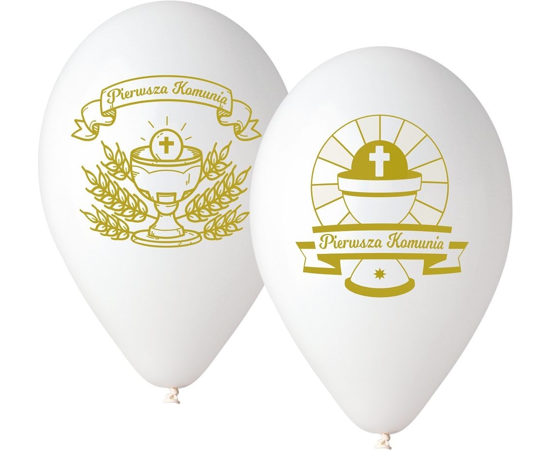 Balony koloru białego ze złotym nadrukiem, sprawdzą się jako dekoracja podczas uroczystości z okazji I-ej Komunii Świętej. Wielkość balonu 12 cali (30 cm). W opakowaniu 5 sztuk.