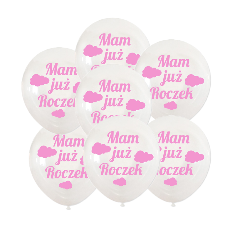 Balon dekoracyjny/urodzinowy przeźroczysty, z nadrukowanymi pierzastymi chmurkami i napisem ” Mam już roczek” w kolorze różowym.