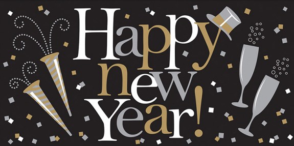 Foliowy plakat z napisem HAPPY NEW YEAR! w kolorystyce czarnej, złotej, srebrnej oraz białej. Doskonały do zawieszenia na sali, w domu lub na zewnątrz. Wymiar 85 x 165 cm.