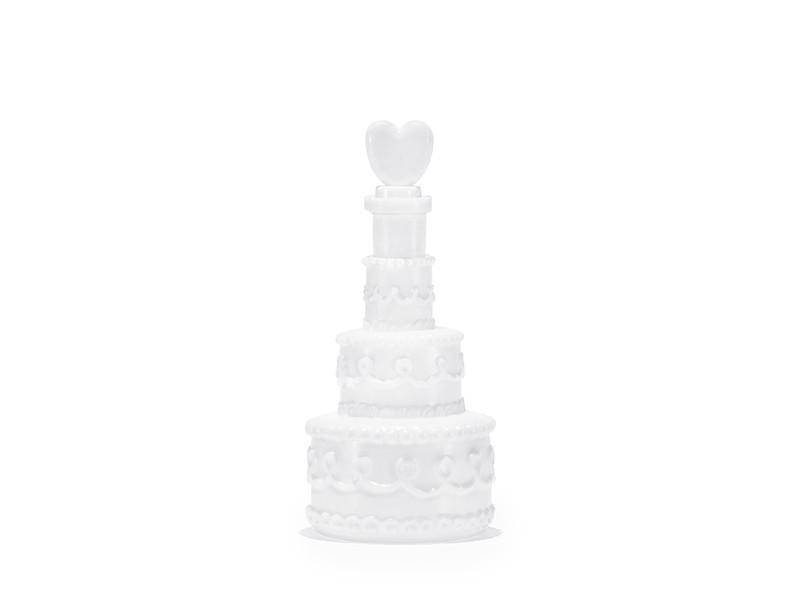 Buteleczka w kształcie torciku z serduszkiem, w której znajduje się płyn do robienia cudownych baniek. Bańki można puszczać zarówno przed kościołem, na sali weselnej lub gdziekolwiek indziej na wolnym powietrzu lub w dużym pomieszczeniu. Ozdobne bańkowe buteleczki możesz jako organizator rozdać gościom lub jeśli jesteś gościem po prostu zabrać je na uroczystość zaślubin i zrobić wrażenie na innych nietypowym wkładem w uroczystość.