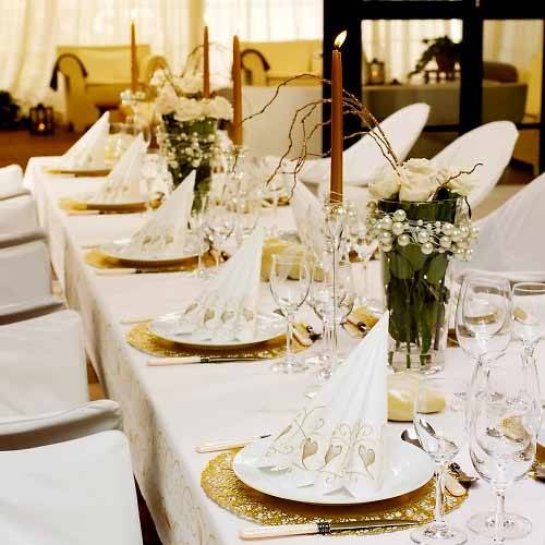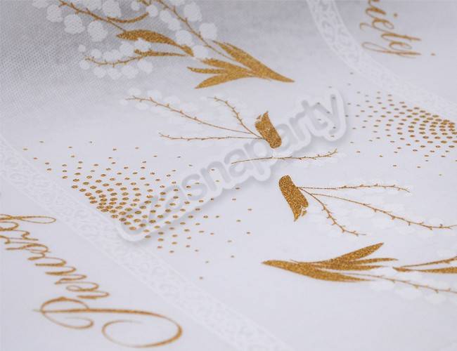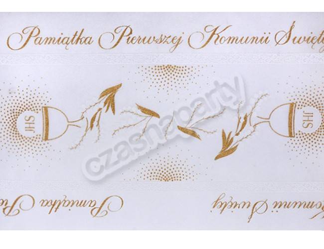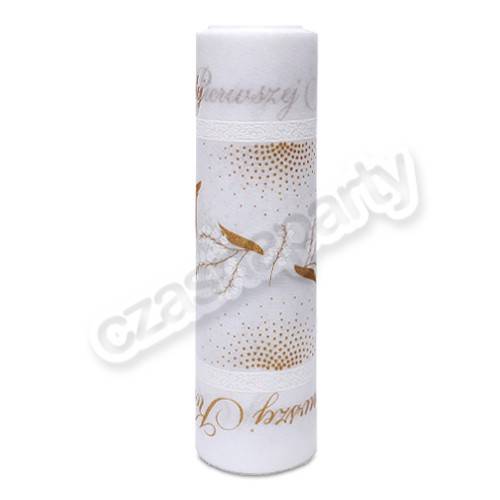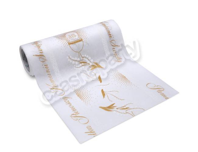 Biały bieżnik flizelinowy ze złotym i białym nadrukiem na Pierwszą Komunię Świętą. Szerokość 35 cm, długość 10 metrów. Bieżnik można dowolnie przycinać. Doskonała dekoracja na komunijny stół.