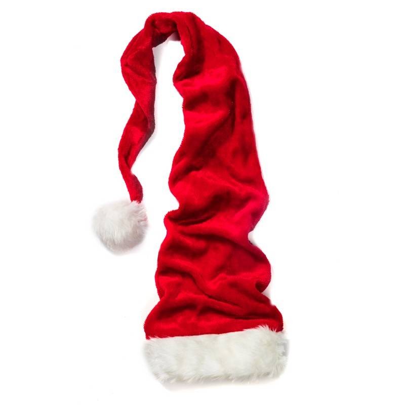 Mega czapa mikołaja ma aż 150 cm długości! Wykonana z grubego materiału pluszowego i ozdobiona gęstym futerkiem. Obwód głowy ok 54 cm. Po nałożeniu czapka sięga, w przypadku osoby o średnim wzroście, do kolan!