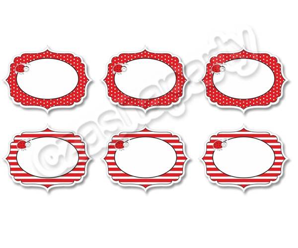 Etykiety na Biedronka, trzy sztuki ze wzorem w kropki, trzy sztuki ze wzorem w paski, wymiary 9 x7 cm.