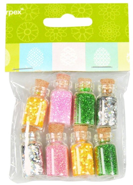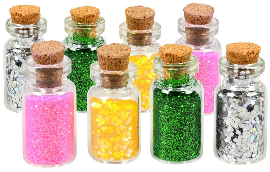 Fiolki z brokatem różnej wielkości i w różnych kolorach. Pakowane 8×2 g.