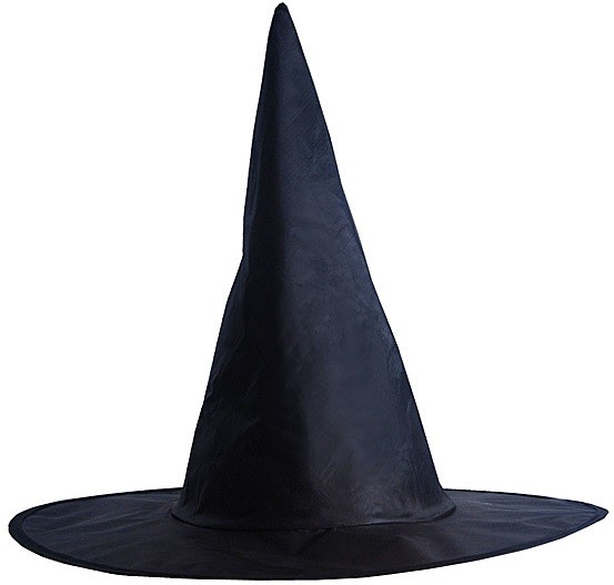 Kapelusz wiedźmy w kolorze czarnym, średnica otworu na głowę 19 cm, średnica ronda 38 cm, wysokość 35 cm.