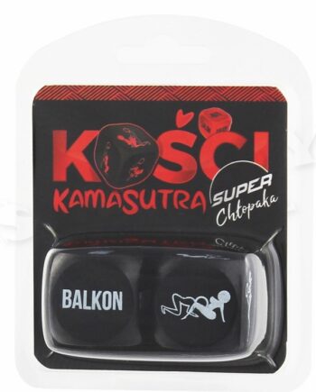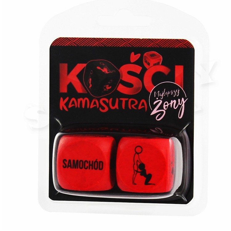 Zestaw dwóch kostek erotycznych. Na jednej znajdują się miejsca, na drugiej pozycje jakie należy wykonać z wylosowanym miejscu. Kości wykonane z drewna.