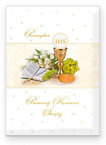 Pamiątka Pierwszej Komunii Świętej – książeczka Komunijna. Posiada miejsca na zdjęcia, piękne ilustracje, cytaty, modlitwy i miejsce na życzenia.