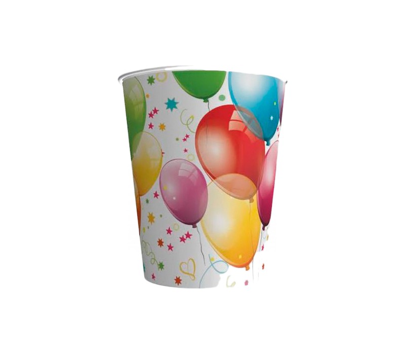 Jednorazowe kubki papierowe z motywem balonów.  Pojemność 250 ml.  Wytrzymałe i bezpieczne. Idealny dodatek do przyjęcia urodzinowego czy garden party. Opakowanie zawiera 8 szt. kubków.