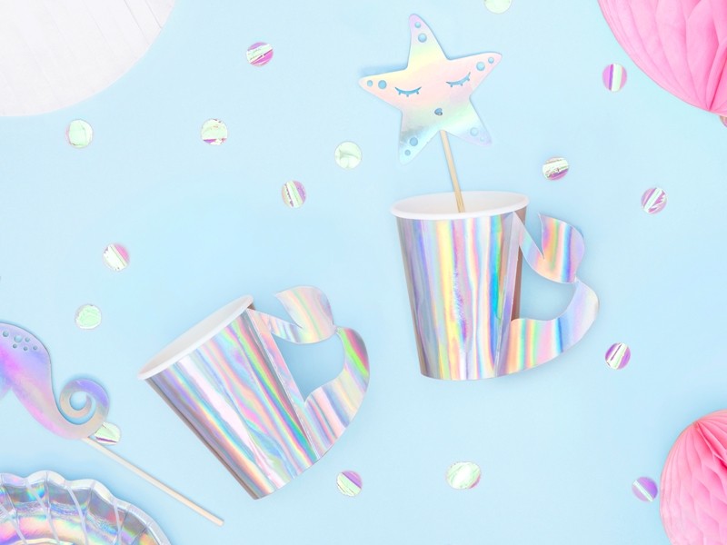 Kubeczki Syrenka wykonane z papieru w kolorze opalizującym z uchem w kształcie ogonka, pojemność ok. 220 ml. Opakowanie zawiera 6 szt.