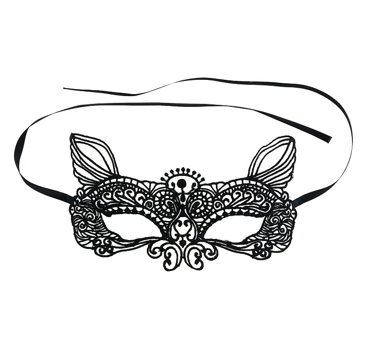 Ażurowa, czarna maska mocowana na satynową wstążkę.