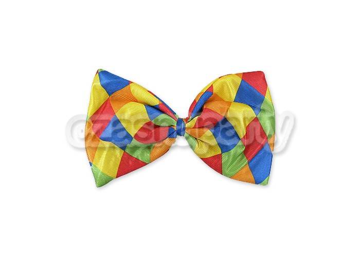 Wielokolorowa mucha klauna wykonana z welurowego materiału, mocowana na gumkę. Wymiary – 38cm x 19cm
