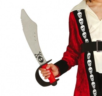 Miecz pirata wykonany z bezpiecznej pianki, w kolorze szarym z czarną rękojeścią. Długość 45 cm