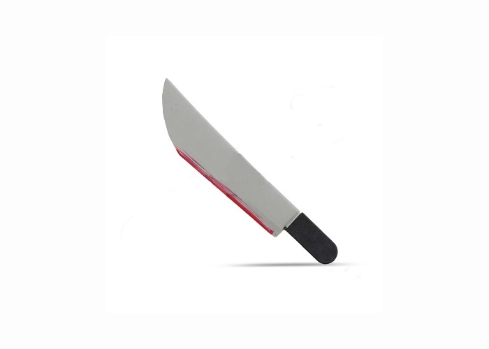 Nóż wykonany z pianki. Ostrze koloru szarego z zakrwawioną końcówką. Uchwyt czarny. Długość całkowita : 30 cm.