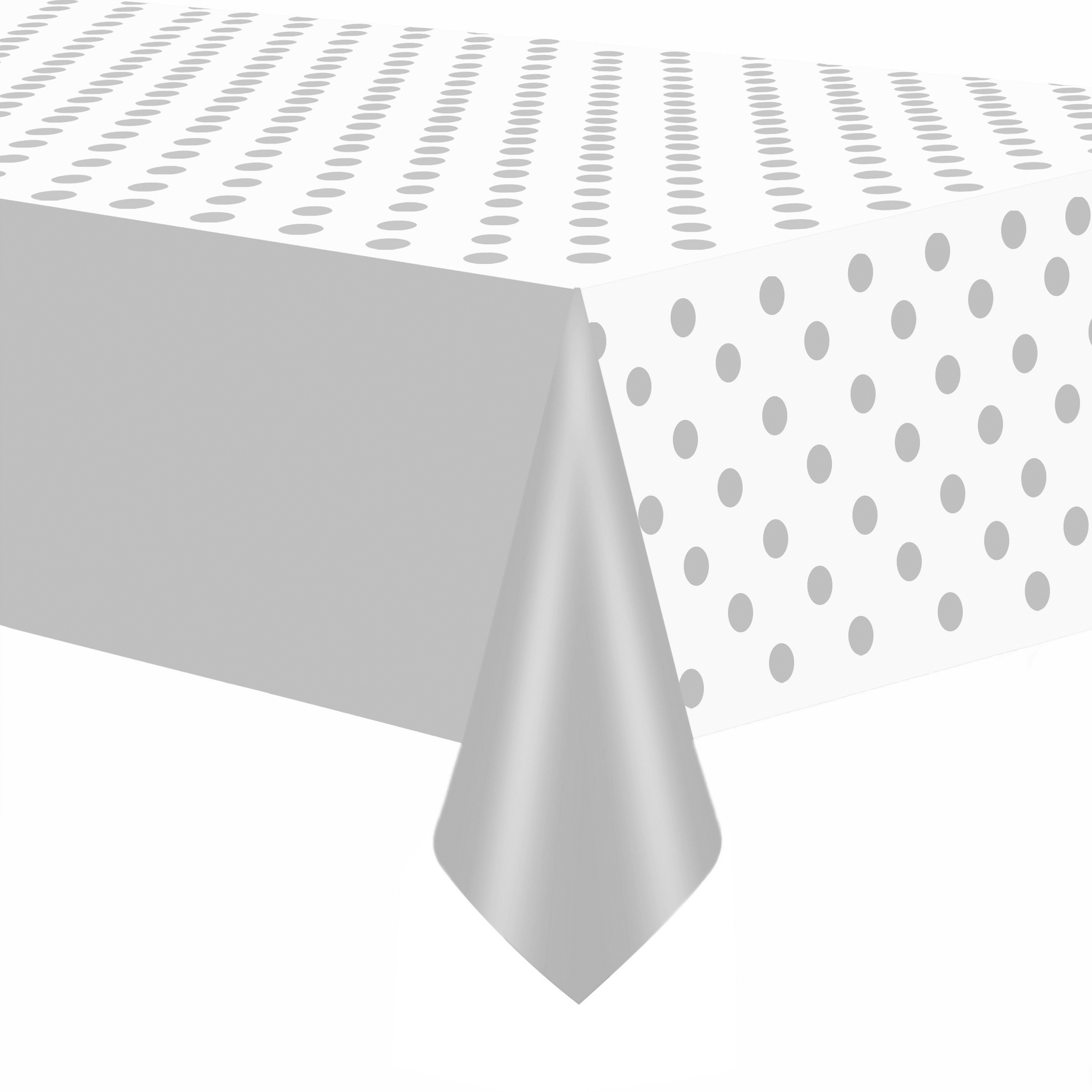 Obrus foliowy w kolorze srebrnym w groszki 137 x 274 cm. Idealnie sprawdzi się na wieczorze panieńskim, 18 urodzinach czy innej odjechanej imprezie.