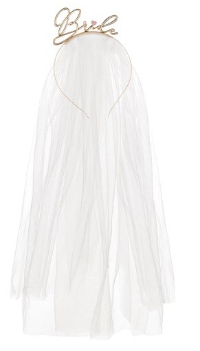 Metalowa opaska z napisem Bride w kolorze złotym i z białym welonem o długości ok. 50 cm.