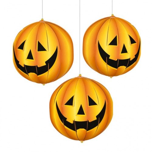 Ozdoba wisząca Dynie 3 szt Ozdoba jednostronna wykonana z papieru. Na górnej części plastikowy haczyk umożliwiający zawieszenie dekoracji. Śliczny dodatek na każde przyjęcie.
