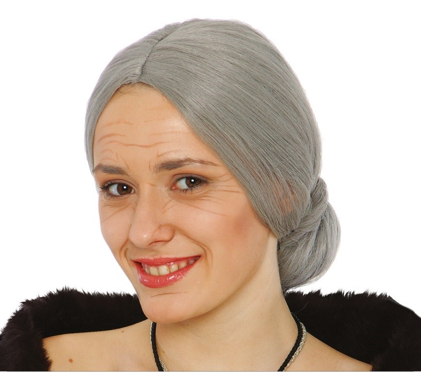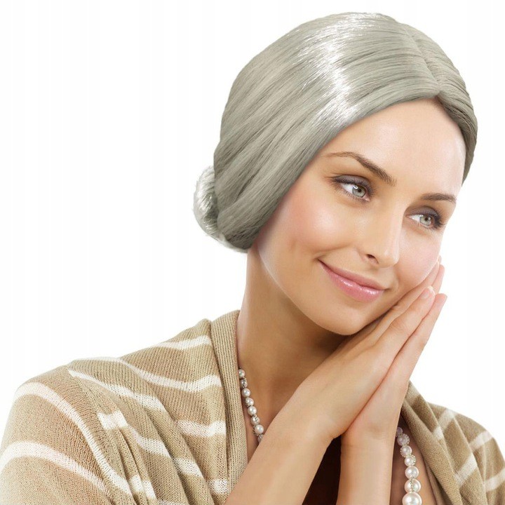 Peruka siwa z kokiem. Wykonana z miękkiego włókna syntetycznego. Dzięki wszytym gumkom pasuje na każdy rozmiar głowy, a cienka siateczka zapewnia stały dopływ powietrza.