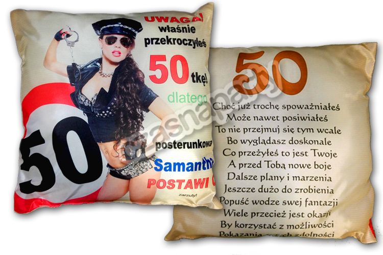 Poduszka z dwustronnym nadrukiem, wykonana z błyszczącego materiału. Wielkość 35 x 35 cm.