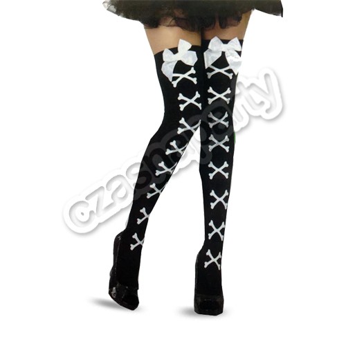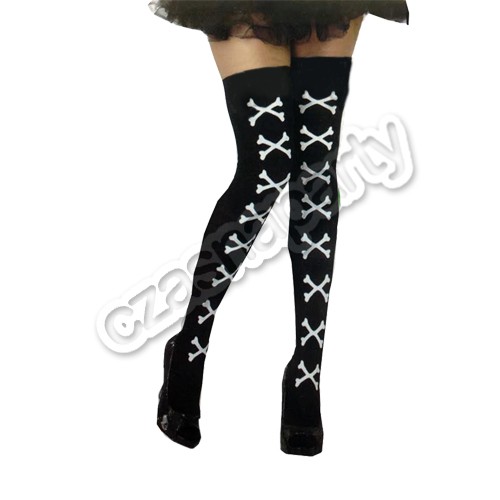 Czarne pończochy z nadrukiem w postaci skrzyżówanych kosci. Rozmiar uniwersalny.
