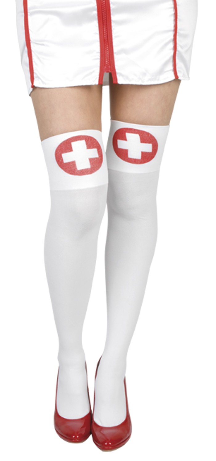 Białe pończochy z nadrukowanym czerwonym krzyżem. Rozmiar uniwersalny.