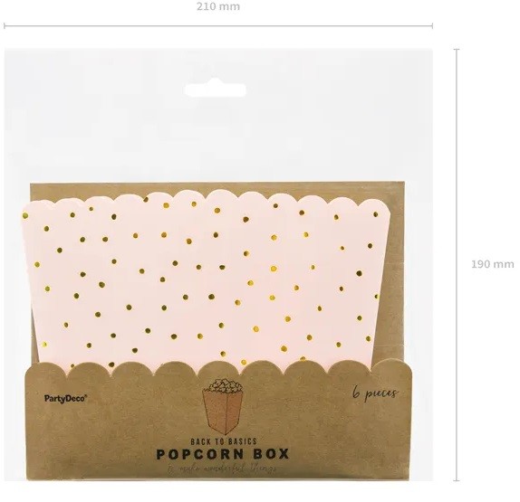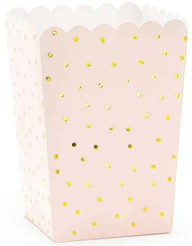 Pudełka na popcorn w kolorze jasnoróżowym w złote kropki, wymiary po złożeniu ok. 7 x 7 x 12.5 cm.