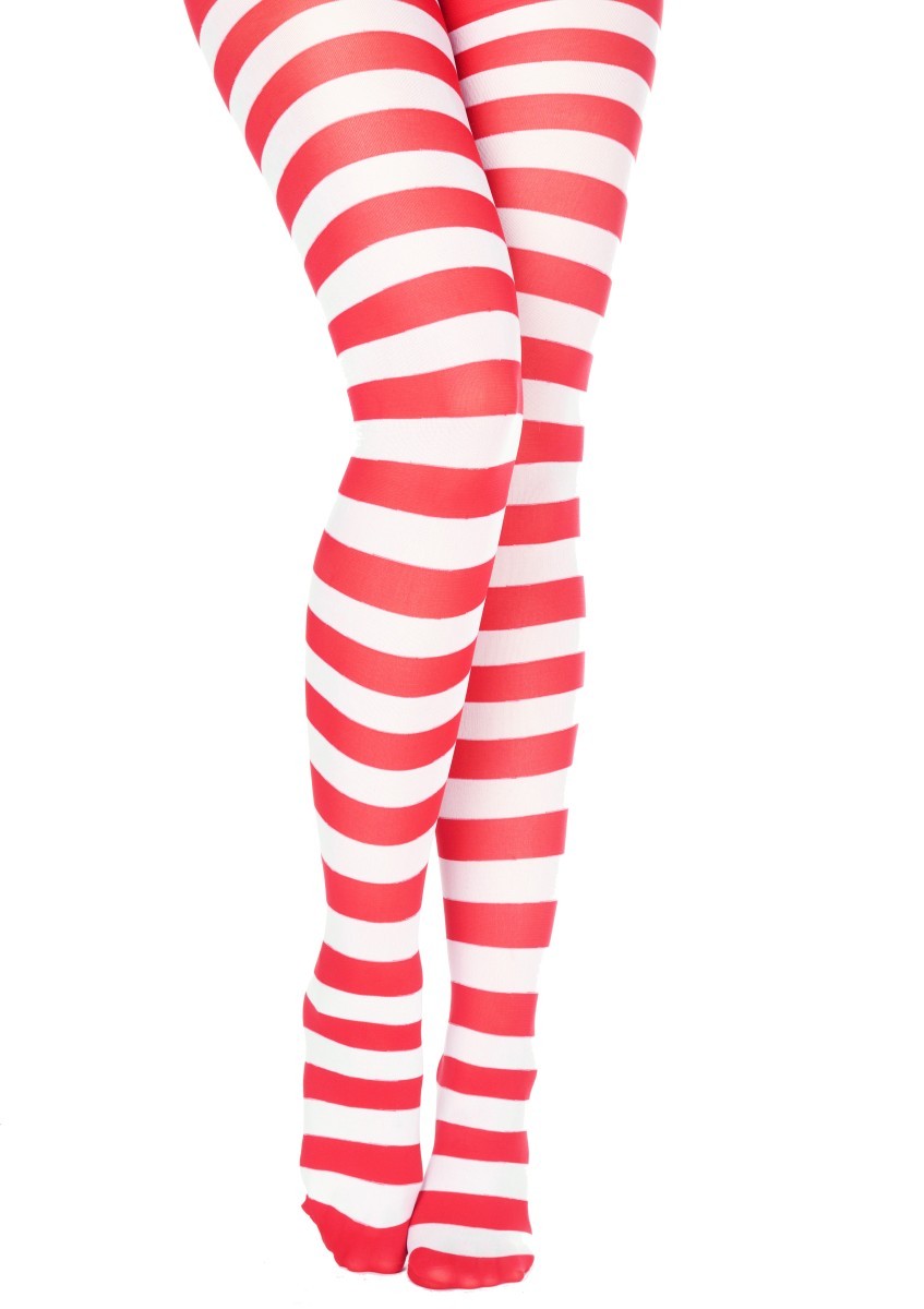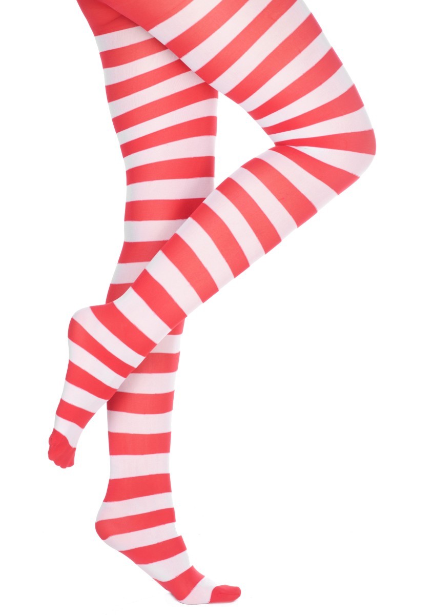 Rajstopy w świątecznym stylu, w czerwono-białe paski. Rozmiar uniwersalny. Doskonały dodatek do stroju Pani elf, elfa, pomocnicy mikołaja. Możesz również użyć rajstop jako ciekawy dodatek do świątecznego ubrania. Materiał: nylon.
