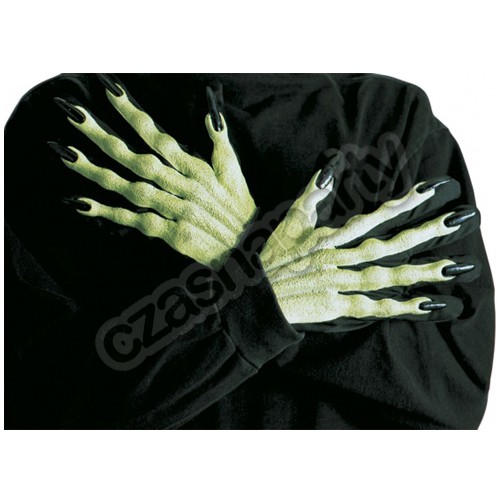 Rękawiczki czarne materiałowe z naklejonymi, lateksowymi kościstymi rękami wiedźmy. Długość rękawiczek ok 23 cm.
