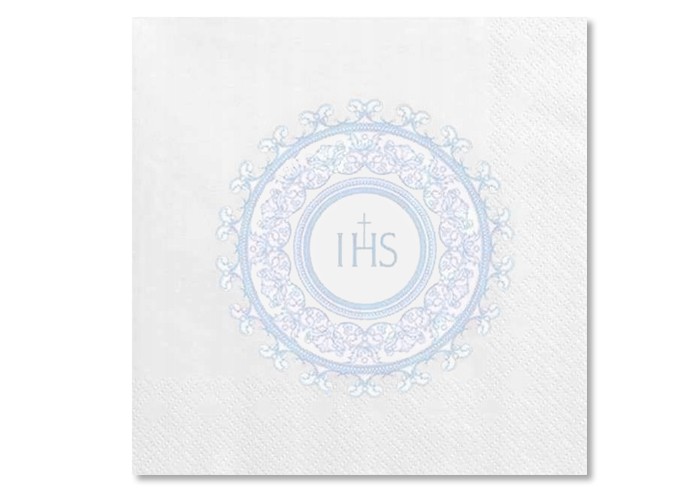 Papierowe serwetki komunijne, białe z błękitnym nadrukiem o wymiarze 33 x 33 cm. W opakowaniu znajduje się 20 szt. serwetek 3-warstwowych. Pięknie wyglądają na komunijnym stole.