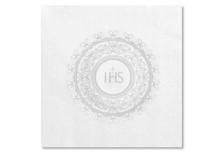 Papierowe serwetki komunijne, białe z szarym nadrukiem o wymiarze 33 x 33 cm. W opakowaniu znajduje się 20 szt. serwetek 3-warstwowych. Pięknie wyglądają na komunijnym stole.