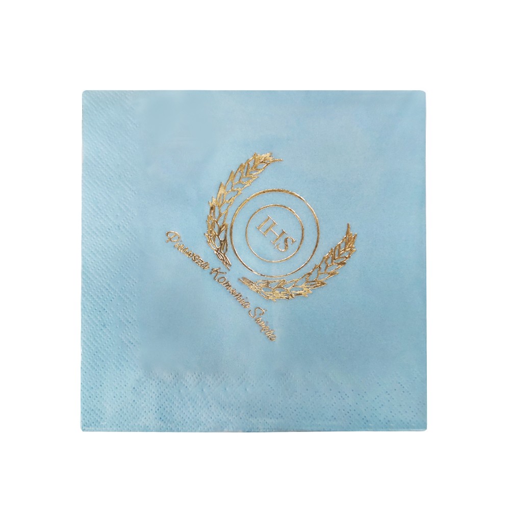 Papierowe serwetki komunijne, niebieskie ze złotym nadrukiem o wymiarze 33 x 33 cm. W opakowaniu znajduje się 20 szt. serwetek 3-warstwowych.