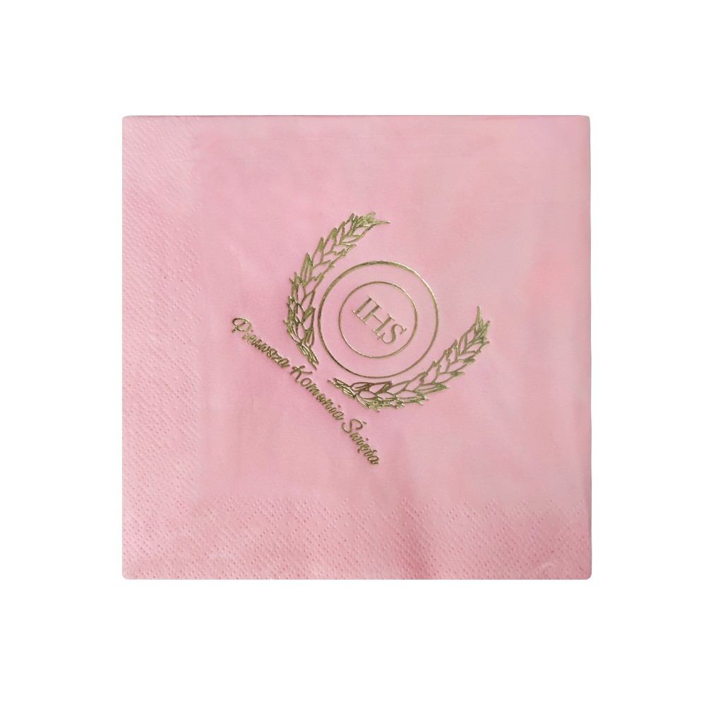 Papierowe serwetki komunijne, różowe ze złotym nadrukiem o wymiarze 33 x 33 cm. W opakowaniu znajduje się 20 szt. serwetek 3-warstwowych.