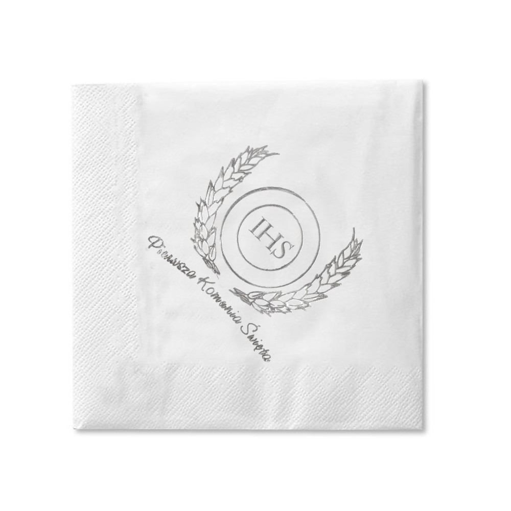 Papierowe serwetki komunijne, białe ze srebrnym nadrukiem o wymiarze 33 x 33 cm. W opakowaniu znajduje się 20 szt. serwetek 3-warstwowych.