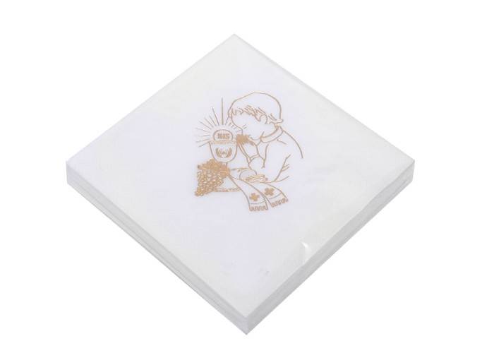 Papierowe serwetki komunijne, białe ze złotym nadrukiem o wymiarze 33 x 33 cm. W opakowaniu znajduje się 20 szt. serwetek 3-warstwowych.