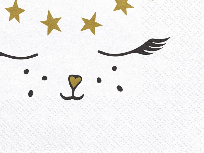 Serwetki papierowe Kotek w kolorze białym z nadrukiem, wymiary po rozłożeniu ok. 33 x 33 cm, wymiary po złożeniu ok. 16,5 x 16,5 cm.