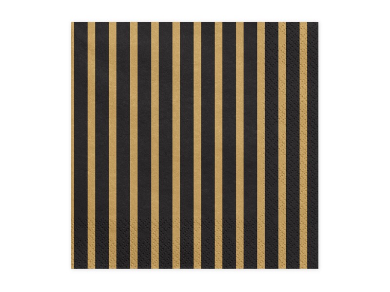 Serwetki papierowe w kolorze czarnym ze złotymi paskami, wymiary po rozłożeniu ok. 33 x 33 cm, wymiary po złożeniu ok. 16,5 x 16,5 cm. W opakowaniu 20 szt.