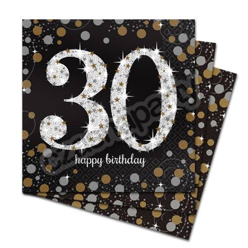 Papierowe, 2-warstwowe serwetki urodzinowe z nadrukiem z elementami złotego i srebrnego, o wymiarze 33 x 33 cm. W opakowaniu znajduje się 16 szt.