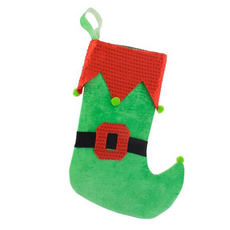 Skarpeta wykonana z grubego zielonego materiału przypominającego welur. W kształcie buta elfa, zdobiona czarnym paskiem oraz czerwoną klamrą. Idealna jako dodatek do prezentu bądź dekoracja wnętrz.
