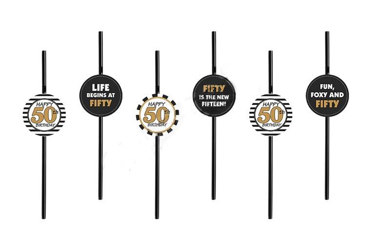 Słomki urodzinowe w kolorze czarnym, długość 24 centymetry. Opakowanie zawiera 6 słomek (mix wzorów).