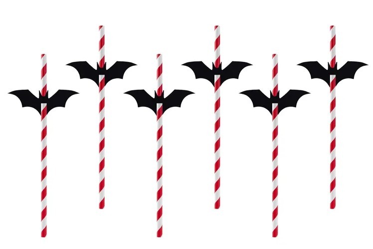Słomki halloweenowe, czerwone z nietoperzami. Długość 24 cm.