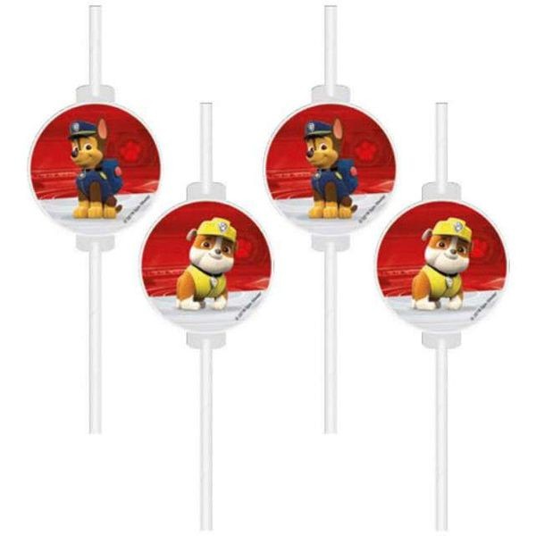 Papierowe słomki z medalionem z nadrukowanymi postaciami z bajki Psi Patrol. W opakowaniu 4 szt. Długość 24 cm.
