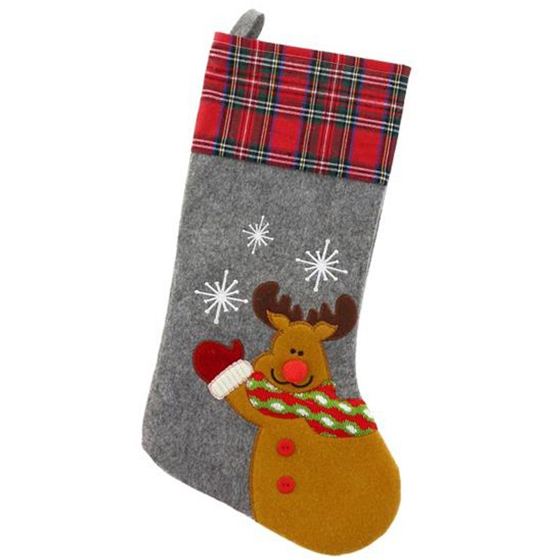 Wykonana z materiału imitującego filc skarpeta świąteczna zdobiona reniferem oraz białymi śnieżkami.