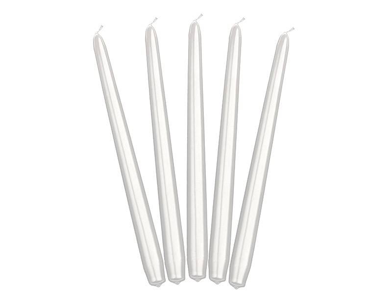 Świeca stożkowa metaliczna w kolorze perłowym, wysokość 29 centymetrów. Czas palenia około 6 godzin.