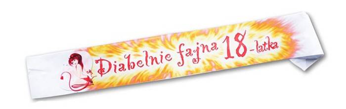 Szarfa biała z kolorowym nadrukiem. Długość 75 cm (obwód 150 cm) oraz szerokości 9,5 cm. Idealny prezent z okazji 18-tych urodzin.