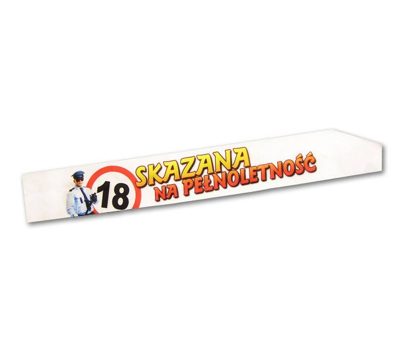 Szarfa biała z kolorowym nadrukiem. Długość 75 cm (obwód 150 cm) oraz szerokości 9,5 cm. Idealny prezent z okazji 18-tych urodzin.